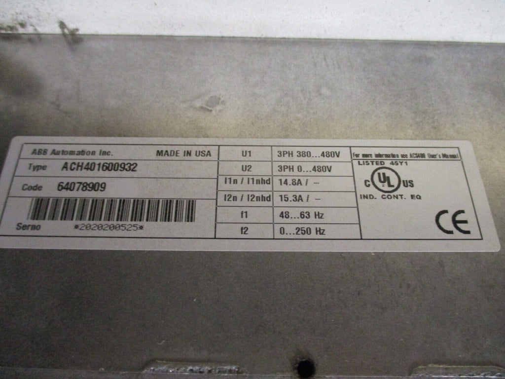 ABB ACH401 AC Drive w/ Bypass ACH401600932 10HP 3Ph w/ Keypad Used Condition: UsedBrand: ABBInput Voltage: 380-480 VMPN: ACH401600932Maximum Load: 10 HPType: General Purpose AC Drive ABB ACH401 AC Drive w/ Bypass ACH401600932 10HP 3Ph w/ Keypad Used ABB ACH401 AC Drive w/ Bypass Part #: ACH401600932 10 HP 3Ph Input:380-480 V14.8 A48-63 HzOutput:0-480 V15.3 A0-250 Hzw/ Keypad Used Loc: AB11-7138 / AB9K3 ABB ACH401 AC Drive w/ Bypass Part #: ACH401600932 10 HP 3Ph Input: 380-480 V 14.8 A 48-63 Hz Output: 0-480 V 15.3 A 0-250 Hz w/ Keypad Uséd Loc: AB11-7138 / AB9K3