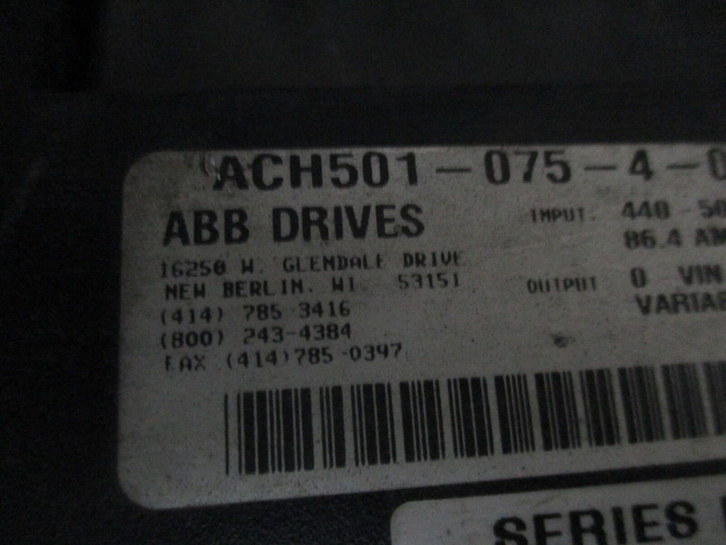 ABB ACH500 AC Drive ACH501-075-4-09P2 75HP 3Ph Input: 440-500V 50/60Hz Used Condition: UsedBrand: ABBMPN: ACH501-075-4-09P2 ABB ACH500 AC Drive ACH501-075-4-09P2 75HP 3Ph Input: 440-500V 50/60Hz Used ABB ACH500 AC Drive Part #: ACH501-075-4-09P2 75HP 3Ph Input: 440 - 500V 50/60Hz 86.4AOutput:0 - V In0 - 500Hz96AUsedLOC AB4K1-1 ABB ACH500 AC Drive Part #: ACH501-075-4-09P2 75HP 3Ph Input: 440 - 500V 50/60Hz 86.4A Output: 0 - V In 0 - 500Hz 96A Uséd LOC AB4K1-1