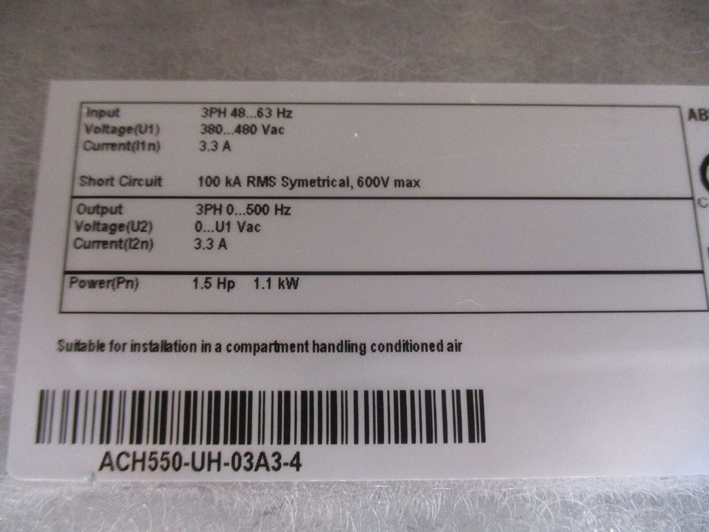 ABB ACH550 AC Drive ACH550-UH-003A3-4 1.5 HP 3Ph w/ Keypad Used_x000D_ ABB ACH550 AC Drive Part #: ACH550-UH-003A3-4 1.5 HP 3Ph Input: 48-63 Hz 380-480 Vac 3.3 A Output: 0-500 Hz 0-U1 Vac 3.3 A w/ Keypad *No Terminal Cover* Used Loc: 50D4-3