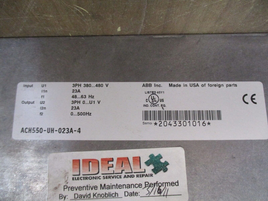 ABB ACH550 AC Drive ACH550-UH-023A-4 15HP 3Ph w/ Keypad Used Condition: UsedBrand: ABBInput Voltage: 380-480 VMPN: ACH550-UH-023A-4Maximum Load: 15 HPModel: ACH550Type: General Purpose AC Drive ABB ACH550 AC Drive ACH550-UH-023A-4 15HP 3Ph w/ Keypad Used ABB ACH550 AC Drive Part #: ACH550-UH-023A-4 15 HP 3Ph Input:380-480 V23 A48-63 HzOutput:0...U1 V23 A0-500 Hzw/ Keypad*Missing Terminal Cover* Used Loc: AB11-5548 / AB9D3 ABB ACH550 AC Drive Part #: ACH550-UH-023A-4 15 HP 3Ph Input: 380-480 V 23 A 48-63 Hz Output: 0...U1 V 23 A 0-500 Hz w/ Keypad *Missing Terminal Cover* Uséd Loc: AB11-5548 / AB9D3