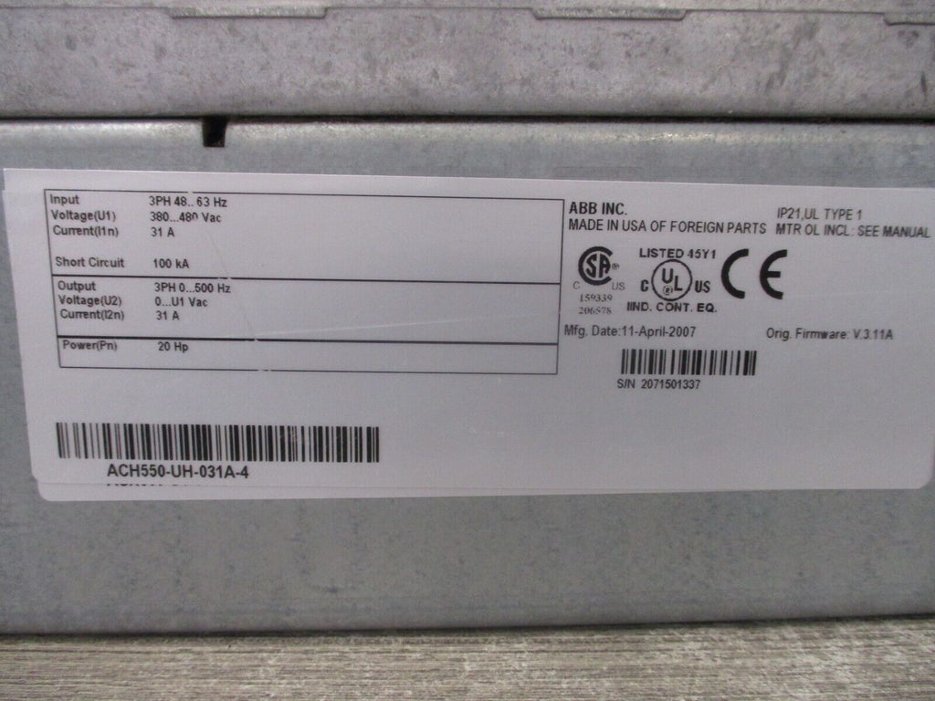 ABB ACH550 AC Drive Part #: ACH550-UH-031A-4 20HP 3Ph Input:3PH 48..63 Hz /380...480 Vac / 31A / 100KA Output: 3PH 0...500 Hz / 0...U1 Vac / 31 A W/Keypad Used LOC AB11-7534