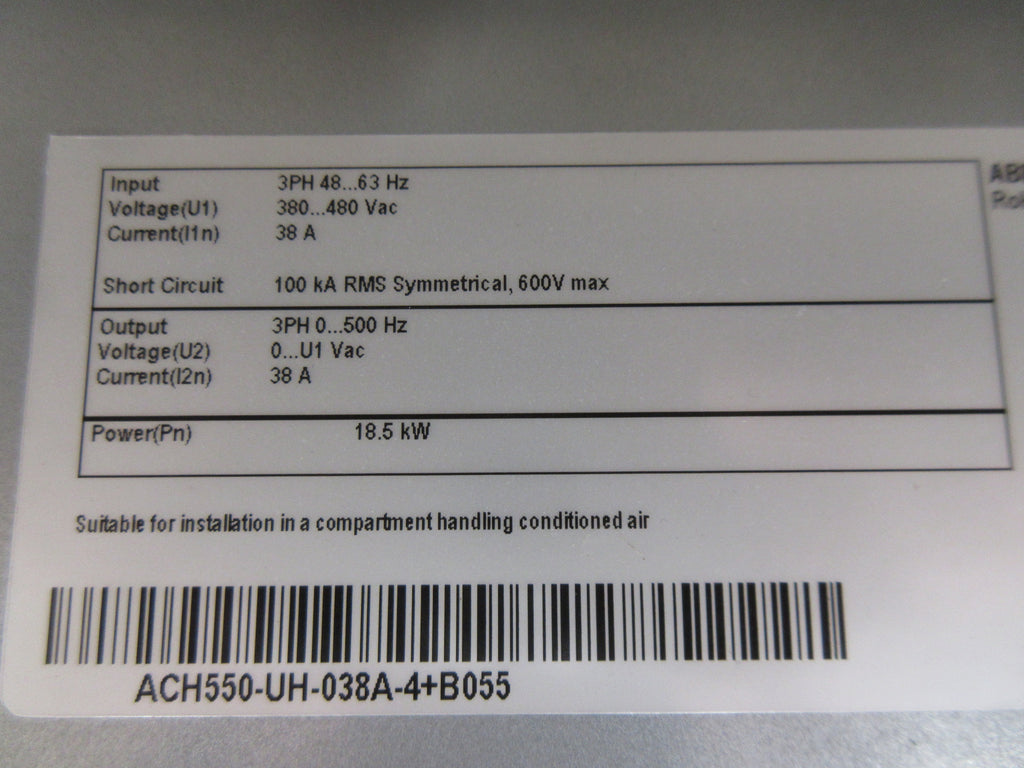 ABB ACH550 AC Drive Part #: ACH550-UH-038A-4+B055 25 HP 3Ph Input: 48-63 Hz 380-480 VAC 38 A Output: 0-500 Hz 0-U1 VAC 38 A Type 12 Enclosure w/ Keypad Used Loc: AB11-8338 / AB24J2