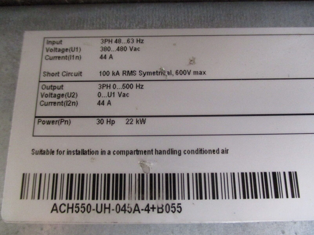 ABB ACH550 AC Drive ACH550-UH-045A-4+B055 30HP 3Ph Type 12 Enclosure w/ Keypad_x000D_ Condition: UsedBrand: ABBInput Voltage: 380-480 VMPN: ACH550-UH-045A-4+B055Maximum Load: 30 HPType: General Purpose AC Drive ABB ACH550 AC Drive ACH550-UH-045A-4+B055 30HP 3Ph Type 12 Enclosure w/ Keypad ABB ACH550 AC Drive Part #: ACH550-UH-045A-4+B055 30 HP 3Ph Input:380-480 VAC44 A48-63 HzOutput:0-U1 VAC44 A0-500 HzType 12 Enclosure w/ Keypad Used Loc: 50D2-3 ABB ACH550 AC Drive Part #: ACH550-UH-045A-4+B055 30 HP 3Ph Input: 380-480 VAC 44 A 48-63 Hz Output: 0-U1 VAC 44 A 0-500 Hz Type 12 Enclosure w/ Keypad Uséd Loc: 50D2-3