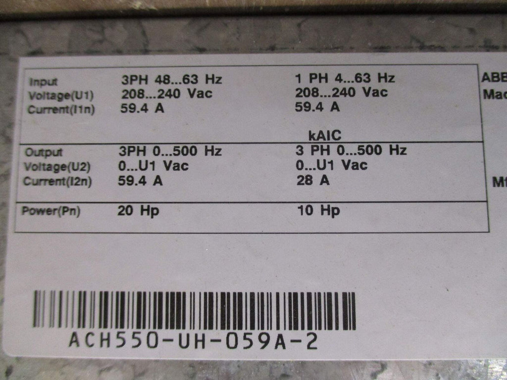 ABB ACH550 AC Drive ACH550-UH-059A-2 20HP / 10HP w/ Keypad Used ABB ACH550 AC Drive Part #: ACH550-UH-059A-2 20 HP / 10 HP Input: 48-63 Hz 208-240 VAC 59.4 A Output: 0-500 Hz 0-U1 VAC 59.4 A w/ Keypad Used Loc: 50E2-1