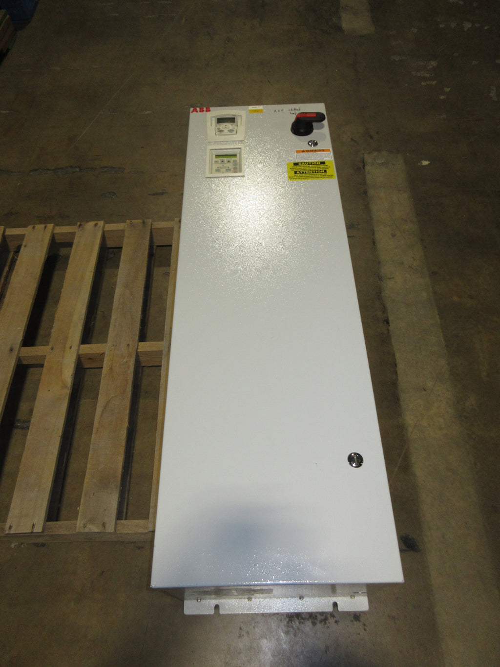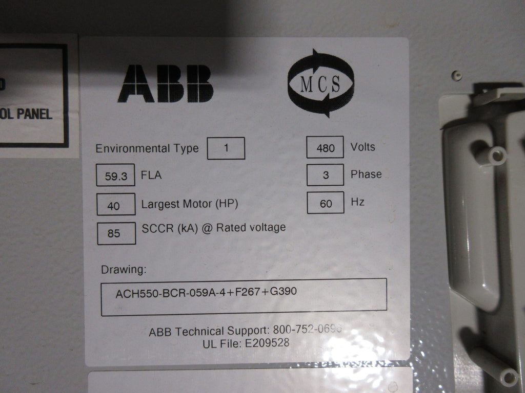 ABB ACH550 AC Drive w/ Bypass Part #: ACH550-BCR-059A-4+F267+G390 40 HP 480 V 3Ph 60 Hz Dims: 54" x 18" x 16" Weighs: 200 LBS Used Loc: AB11-8125 / AB24N2
