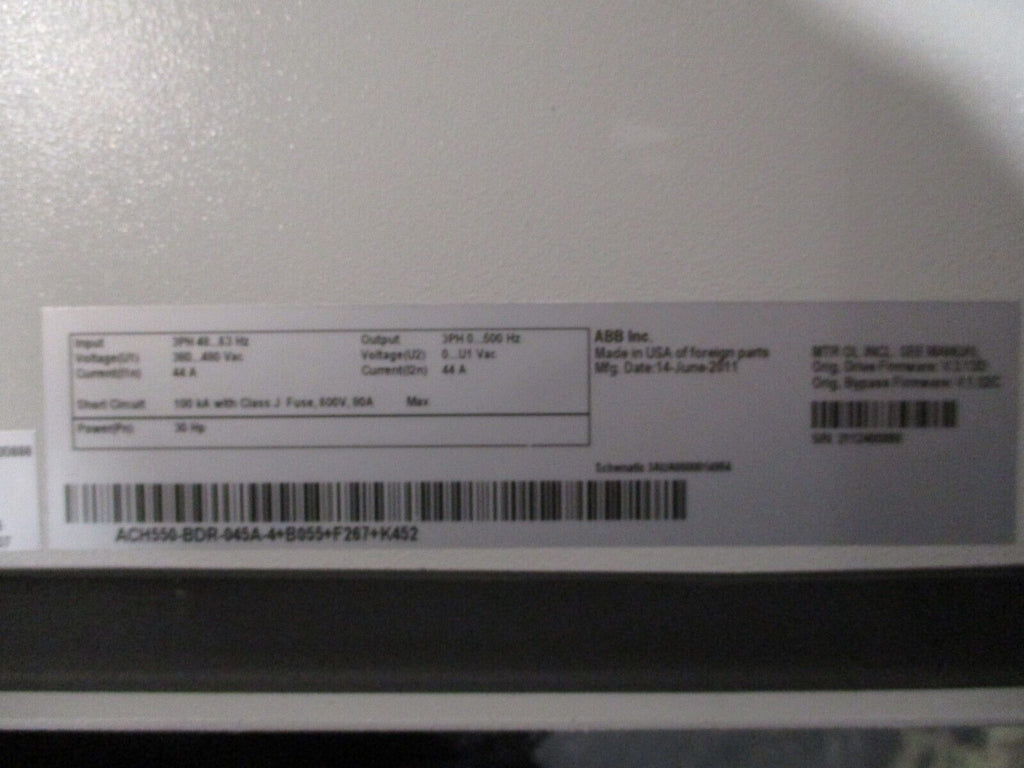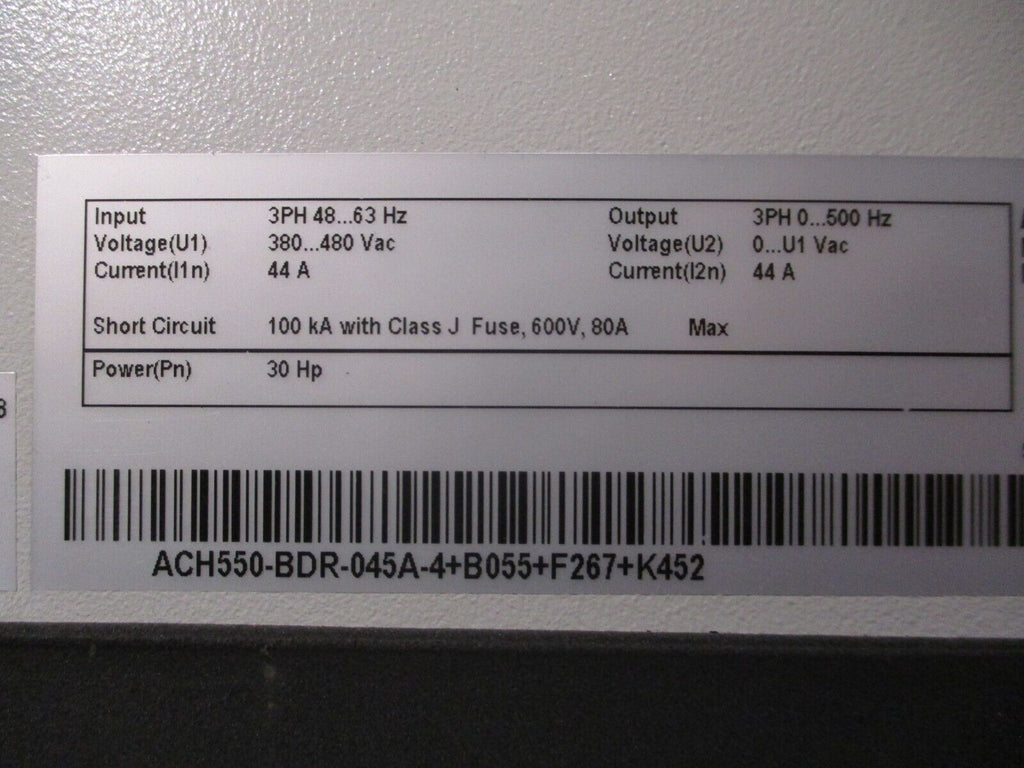 ABB ACH550 AC Drive w/ Bypass ACH550-BDR-045A-4+B055+F267+K452 30HP 3Ph Used Condition: UsedBrand: ABBInput Voltage: 380-480 VMPN: ACH550-BDR-045A-4+B055+F267+K452Maximum Load: 30 HPType: General Purpose AC Drive ABB ACH550 AC Drive w/ Bypass ACH550-BDR-045A-4+B055+F267+K452 30HP 3Ph Used ABB ACH550 AC Drive w/ Bypass Part #: ACH550-BDR-045A-4+B055+F267+K452 30 HP 3Ph Input:48-63 Hz380-480 VAC44 AOutput:0-500 Hz0-U1 VAC44 AType 12 Enclosurew/ KeypadDims: 38" x 23" x 16"Weighs: 161 LBSUsed Loc: AB11-7031 / AB6N2 ABB ACH550 AC Drive w/ Bypass Part #: ACH550-BDR-045A-4+B055+F267+K452 30 HP 3Ph Input: 48-63 Hz 380-480 VAC 44 A Output: 0-500 Hz 0-U1 VAC 44 A Type 12 Enclosure w/ Keypad Dims: 38" x 23" x 16" Weighs: 161 LBS Uséd Loc: AB11-7031 / AB6N2