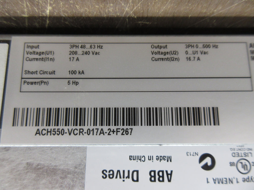 ABB ACH550 AC Drive w/ Bypass Part #: ACH550-VCR-017A-2+F267 5 HP 3Ph Input: 48-63 Hz 208-240 VAC 17 A Output: 0-500 Hz 0-U1 VAC 16.7 A w/ Keypad Dims: 41" x 6" x 11" Weighs: 45 LBS Used Loc: AB11-8269 / AB36K3 / AB13Q5 / AB26E2