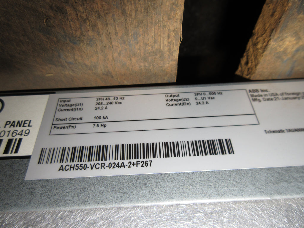 ABB ACH550 AC Drive w/ Bypass ACH550-VCR-024A-2+F267 7.5HP 3Ph w/ Keypad Used ABB ACH550 AC Drive w/ Bypass Part #: ACH550-VCR-024A-2+F267 7.5 HP 3Ph Input: 48-63 Hz 208-240 Vac 24.2 A Output: 0-500 Hz 0-U1 VAC 24.2 A w/ Keypad Dims: 44" x 6" x 12" Weighs: 55 LBS Used Loc: AB11-8134 / AB26D2 / AB31A2