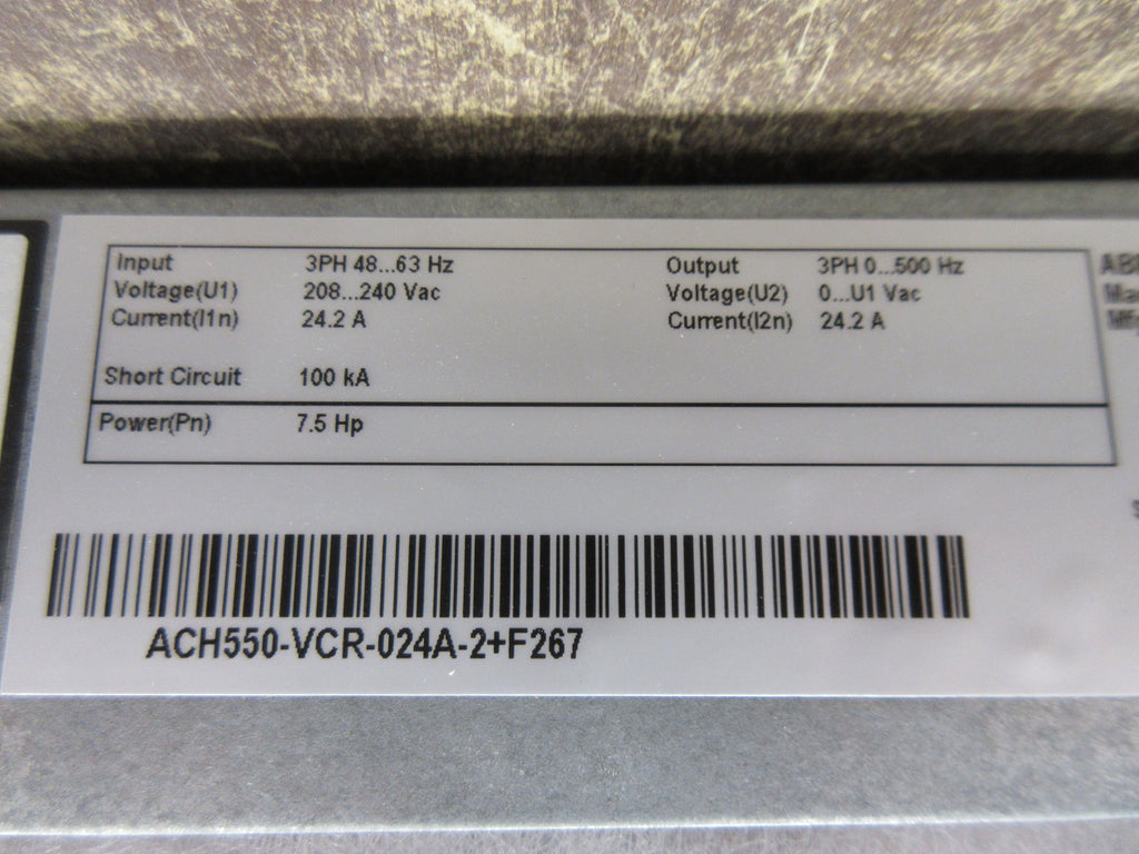 ABB ACH550 AC Drive w/ Bypass ACH550-VCR-024A-2+F267 7.5HP 3Ph w/ Keypad Used ABB ACH550 AC Drive w/ Bypass Part #: ACH550-VCR-024A-2+F267 7.5 HP 3Ph Input: 48-63 Hz 208-240 VAC 24.2 A Output: 0-500 Hz 0-U1 VAC 24.2 A w/ Keypad Dims: 45" x 6" x 11" Weighs: 45 LBS Used Loc: AB11-8267 / AB36K3