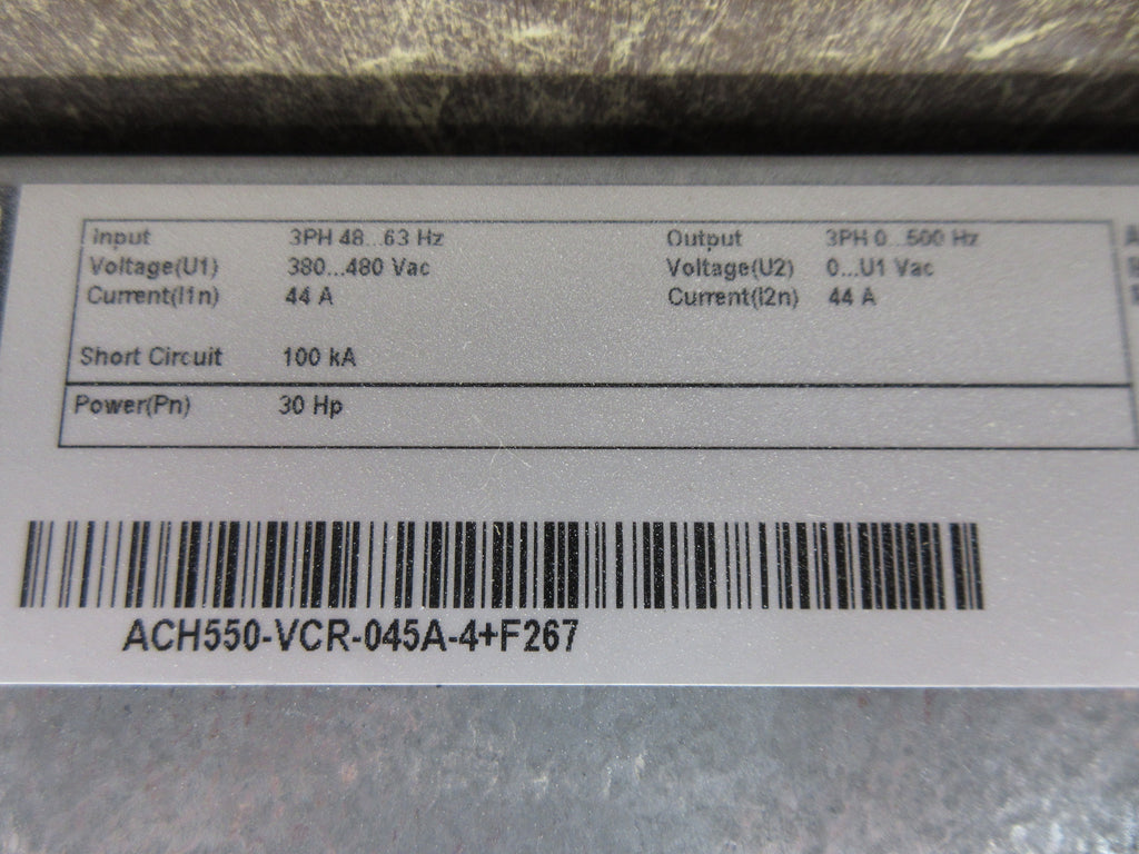 ABB ACH550 AC Drive w/ Bypass Part #: ACH550-VCR-045A-4+F267 30 HP 3Ph Input: 48-63 Hz 380-480 VAC 44 A Output: 0-500 Hz 0-U1 VAC 44 A w/ Keypad Dims: 48" x 9" x 11" Weighs: 70 LBS Used Loc: AB11-8369 / AB41F3 / AB26E2
