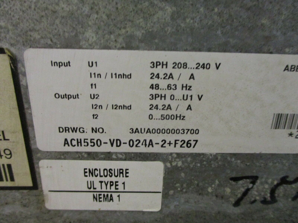 ABB ACH550 AC Drive w/Bypass ACH550-VD-024A-2+F267 7.5HP 3Ph w/Keypad Used_x000D_ Condition: UsedMaximum Load: 7.5 HPCountry/Region of Manufacture: United StatesType: General Purpose AC DriveInput Voltage: 240 VMPN: ACH550-VD-024A-2+F267Brand: ABB ABB ACH550 AC Drive w/Bypass ACH550-VD-024A-2+F267 7.5HP 3Ph w/Keypad Used ABB ACH550 AC Drive w/Bypass Part#: ACH550-VD-024A-2+F267 7.5 HP 3PhInput: 3PH 208...240 V 24.2A 48...63 Hz Output: 3PH 0...U1 V 24.2A 0...500Hzw/Keypad*Bent End*Used loc: AB11-2541 / AB6P2 ABB ACH550 AC Drive w/Bypass Part#: ACH550-VD-024A-2+F267 7.5 HP 3Ph Input: 3PH 208...240 V 24.2A 48...63 Hz Output: 3PH 0...U1 V 24.2A 0...500Hz w/Keypad *Bent End* Uséd loc: AB11-2541 / AB6P2