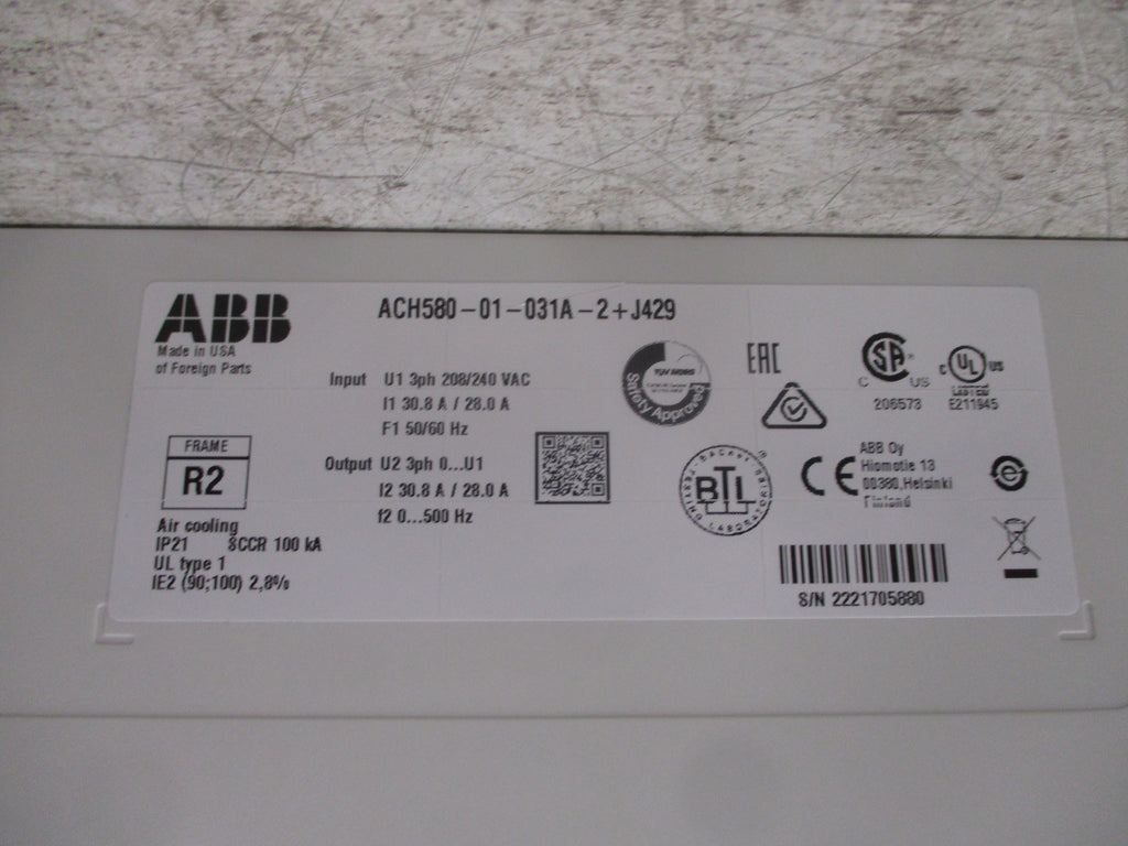 ABB ACH580 AC Drive ACH580-01-031A-2+J429 10HP 3Ph Input: 3ph 208-240VAC 3.8-28.0A 50-60Hz Output: 3ph 0-U1 30.8-28.0A 0-500Hz W/Keypad Used LOC 58D1-3
