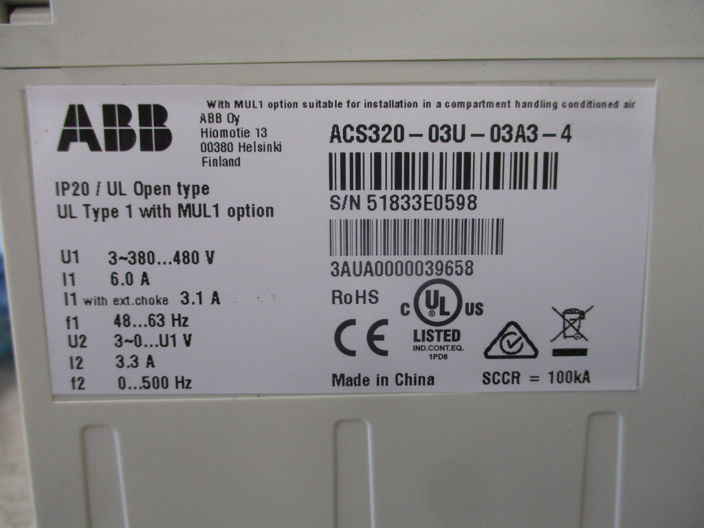 ABB ACS320 AC Drive ACS320-03U-03A3-4 1.5HP 3Ph Input: 3-380-480V 6.0A W/Ext.Choke 3.1A 48-63Hz Output: 3-0-U1V 3.3A 0.500Hz W/Keypad (No Cable) Used LOC 58A1-25