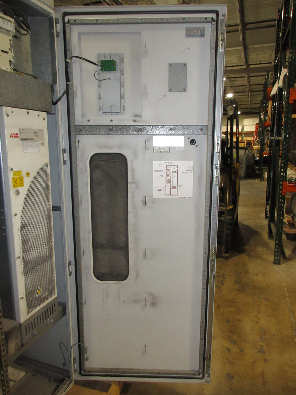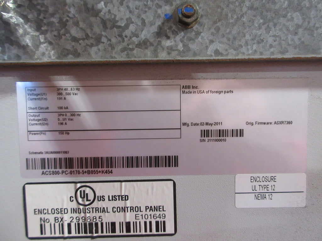 ABB ACS800 AC Drive Part #: ACS800-PC-0170-5+B055+K454 150 HP 3Ph Input: 48-63 Hz 380-500 VAC 191 A Output: 0-300 Hz 0-U1 VAC 196 A Breaker Disconnect Nema 12 Enclosure w/ Keypad Dims: 95" x 33 " x 27" Weighs: 735 LBS Used