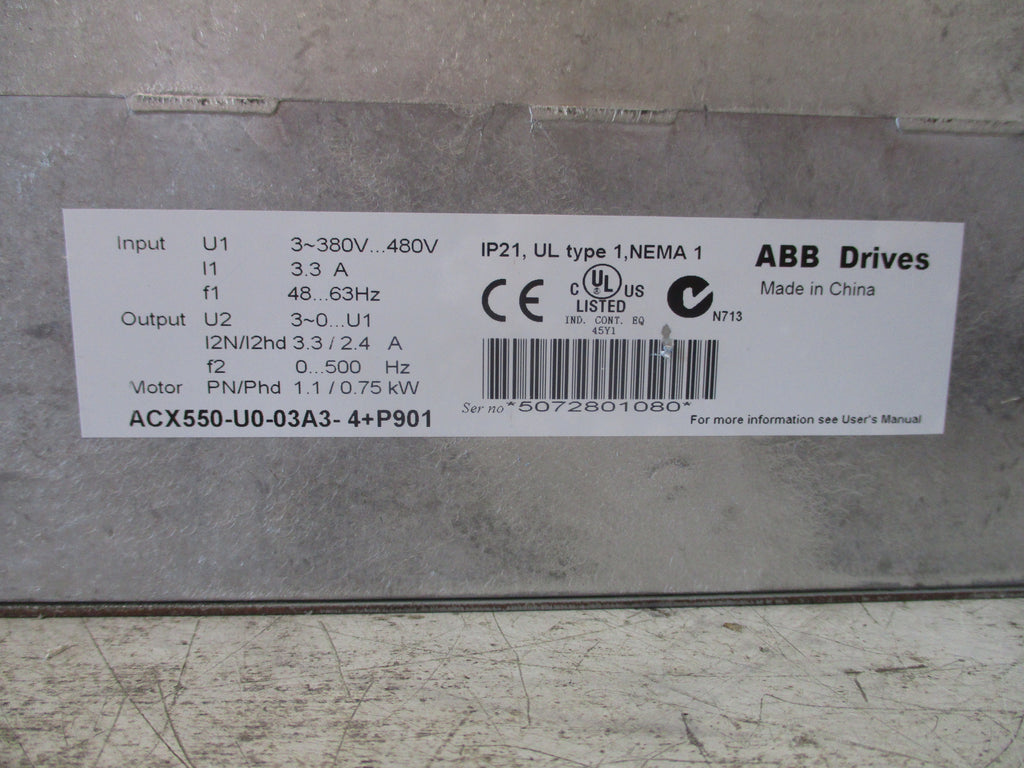 ABB ACX550 AC Drive ACX550-U0-03A3-4+P901 1.5HP 3Ph Input: 380-480V 3.3A 48-63Hz Output: 3.3/2.4A 0-500Hz *Cracked Side* Used LOC 50F4-3