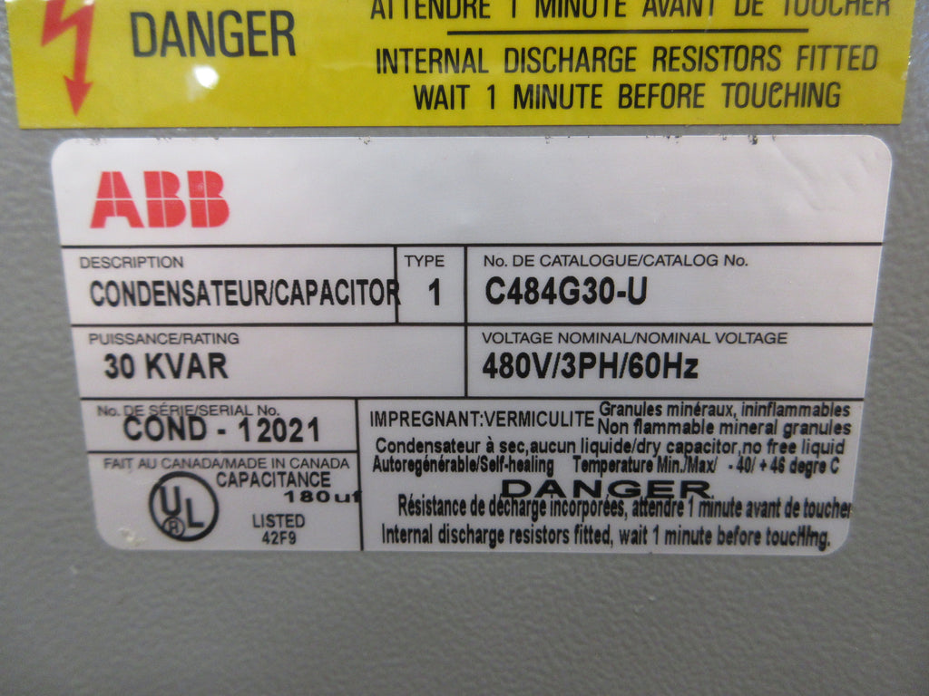 ABB Capacitor Part #: C484G30-U 30kVAR 480V 3Ph 60Hz Used Loc: AB11-9079 / AB6E2