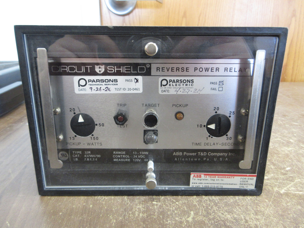 ABB Circuit Shield Reverse Power Relay Part #: 437W4790 24VDC Control Range: 13-150W Used Loc: 57C2-14 / 56D2