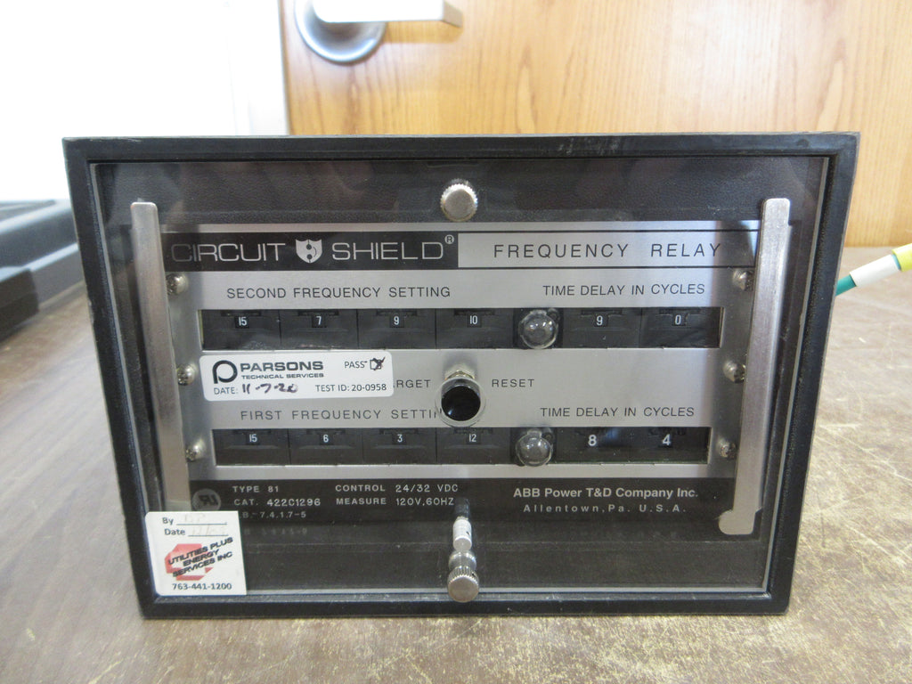 ABB Circuit Shield Type 81 Frequency Relay Part #: 422C1296 24/32 VDC Measure: 120 VAC, 60 Hz Used Loc: 57I5-1