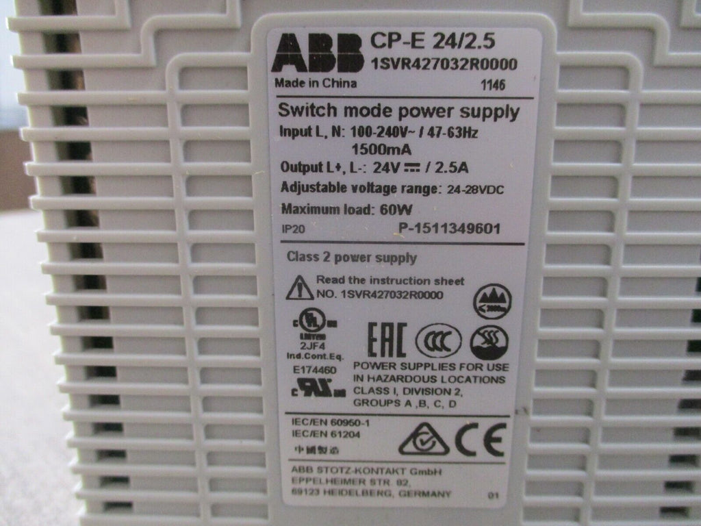ABB CP-E 24/2.5 Power Supply 1SVR427032R0000 60W Used Condition: UsedBrand: ABBColor: WhiteMPN: 1SVR427032R0000 ABB CP-E 24/2.5 Power Supply 1SVR427032R0000 60W Used ABB CP-E 24/2.5 Power Supply Part #: 1SVR427032R0000Input:100-240V47-63Hz1500mAOutput: 24VDC2.5A60W UsedLOC: 29A1-1 ABB CP-E 24/2.5 Power Supply Part #: 1SVR427032R0000 Input: 100-240V 47-63Hz 1500mA Output: 24VDC 2.5A 60W Uséd LOC: 29A1-1