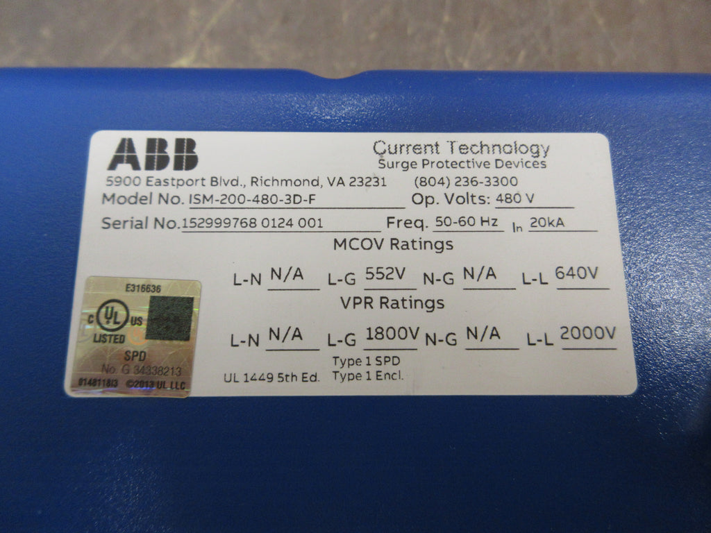 ABB Current Technology Surge Protection Unit Part #: ISM-200-480-3D-F 480 V 50-60 Hz MCOV: L-G 552V L-L 640V VPR: L-G 1800V L-L 2000V New Surplus Loc: AB11-9086 / AB12H2