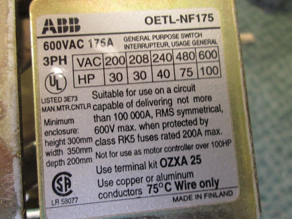 ABB General Purpose Disconnect Switch Part # OETL-NF175 175A...