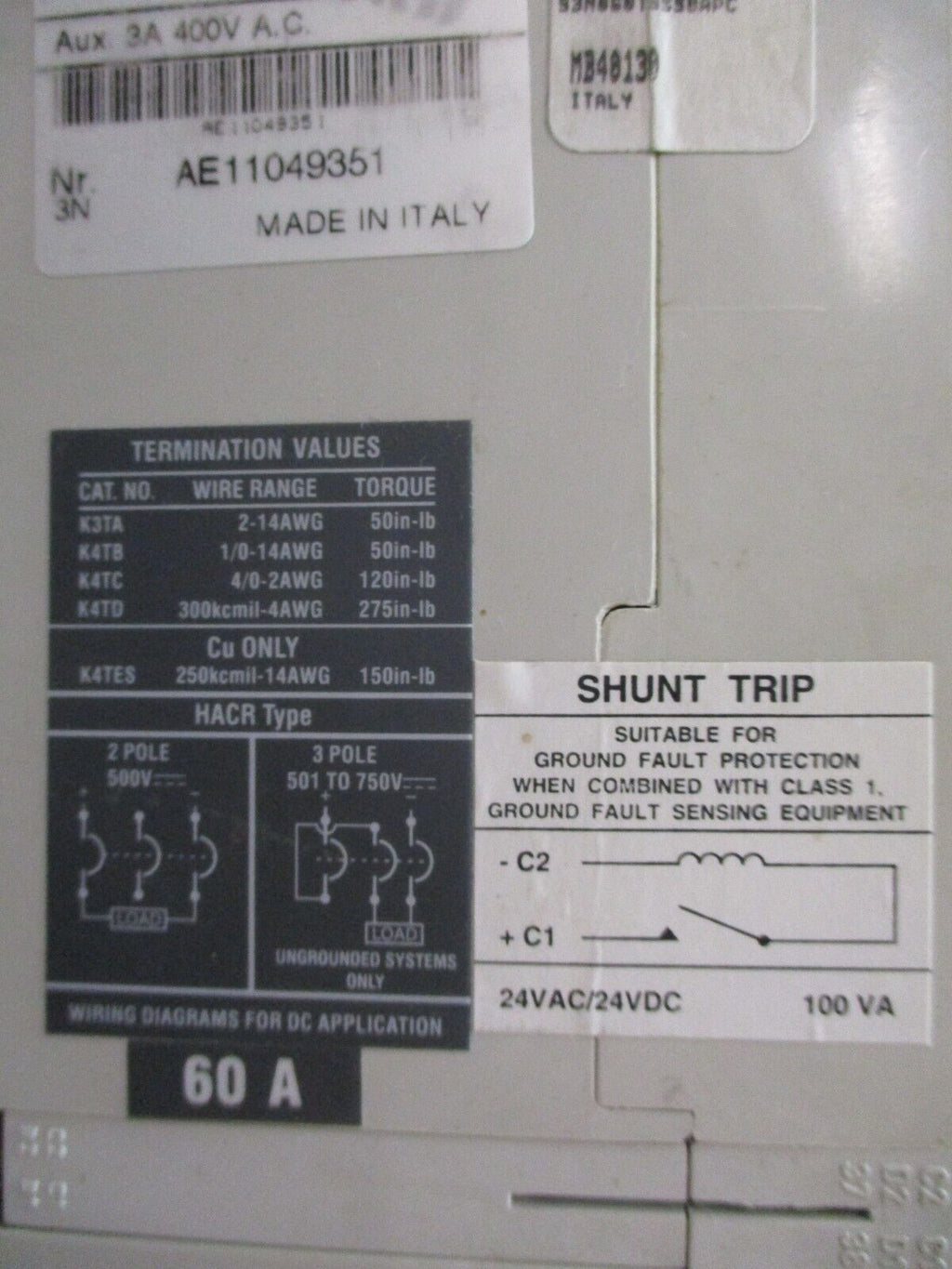ABB Sace S3 Circuit Breaker Part #: S3N 60 A 600 V 3P w/ Mounting Bracket Used Loc: 26E4-8- Part #: S3N