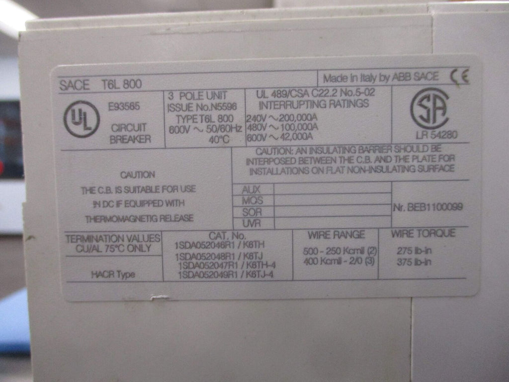 ABB SACE Tmax Breaker Disconnect T6L 800 PR222DS/P 800A 600V 3P *No Handle* Used