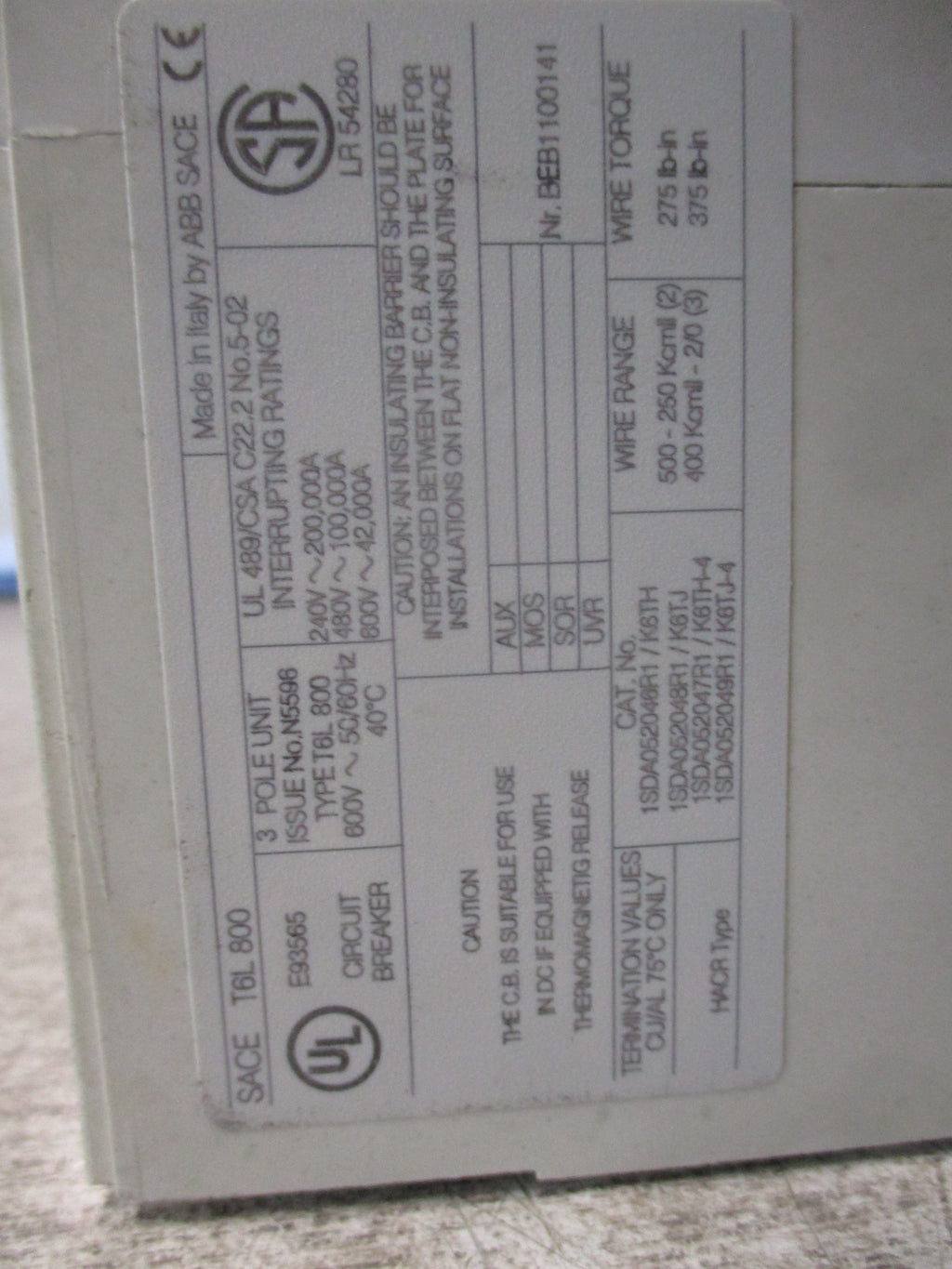 ABB SACE Tmax Breaker Disconnect T6L 800 PR222DS/P 800A 6...
