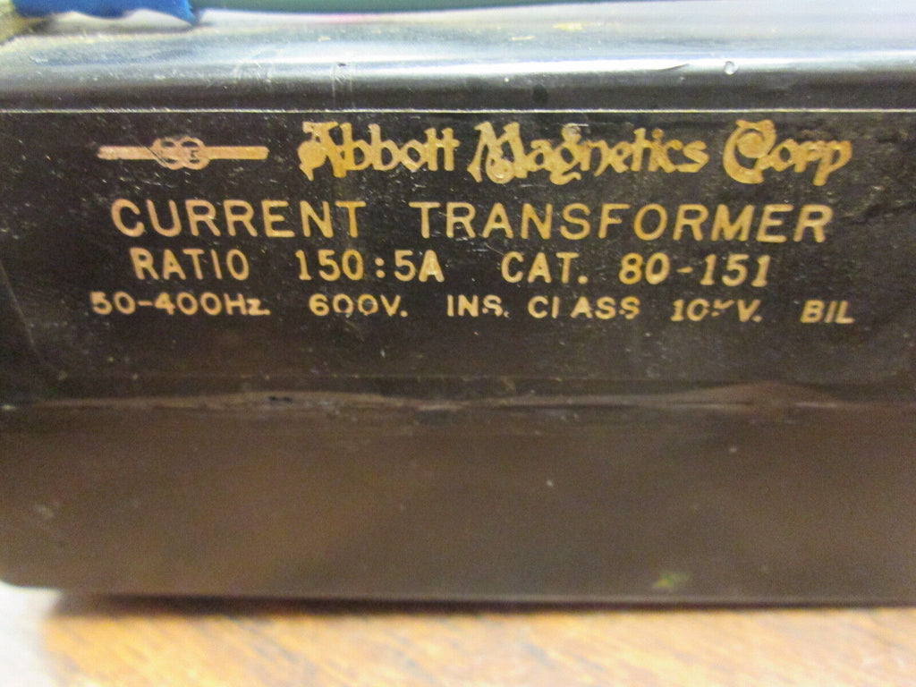 Abbott Magnetics Current Transformer 80-151 Ratio 150:5A 600V 50-400Hz 10KV BIL Condition: UsedMPN: 80-151Brand: Abbott Magnetics Abbott Magnetics Current Transformer 80-151 Ratio 150:5A 600V 50-400Hz 10KV BIL Abbott Magnetics Current Transformer Part #: 80-151 Ratio 150:5A 600V 50-400Hz 10KV BILUsedLOC 15B4-54 Abbott Magnetics Current Transformer Part #: 80-151 Ratio 150:5A 600V 50-400Hz 10KV BIL Uséd LOC 15B4-54
