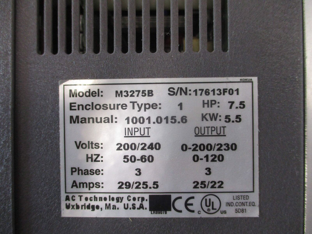 AC Tech MC Series Intelligent AC Drive M3275B 7.5HP 3Ph Input: 200/240V 50-60Hz 3Phase 29/25.5A Output: 0-200/230 0-120Hz 3Phase 25/22A * Missing Cover Screw * Used_x000D_ AC Tech MC Series Intelligent AC Drive M3275B 7.5HP 3Ph Input: 200/240V 50-60Hz 3Phase 29/25.5A Output: 0-200/230 0-120Hz 3Phase 25/22A * Missing Cover Screw * Used LOC 60F4-6