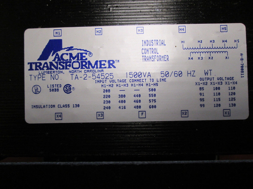 ACME Control Transformer TA-2-545251500VAPri: 208-600VSec: 85-130VUsedLoc. 14I4Loc. 14I4TA-2-545251500VAPri: 208-600VSec: 85-130VUséd