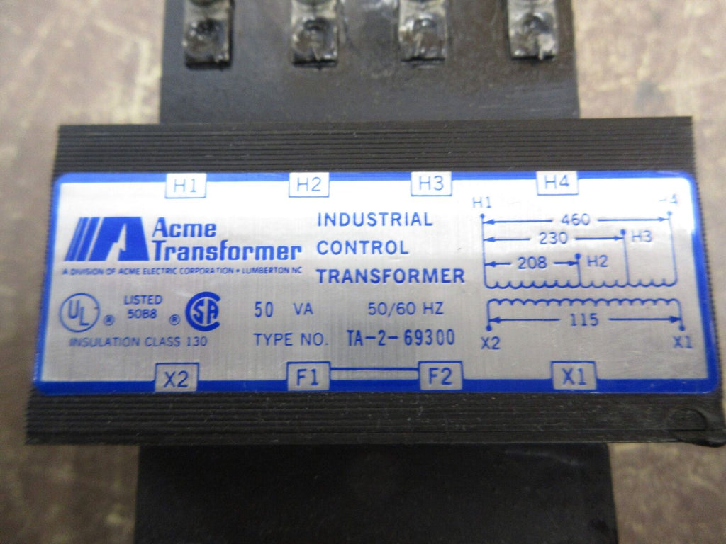 Acme Transformer Control Transformer TA-2-69300 50VA Pri: 208/230/460V Used Acme Transformer Control Transformer Part #: TA-2-69300 50 VA Pri: 208/230/460 V Sec: 115 V 50/60 Hz Used Loc: 59G4-1