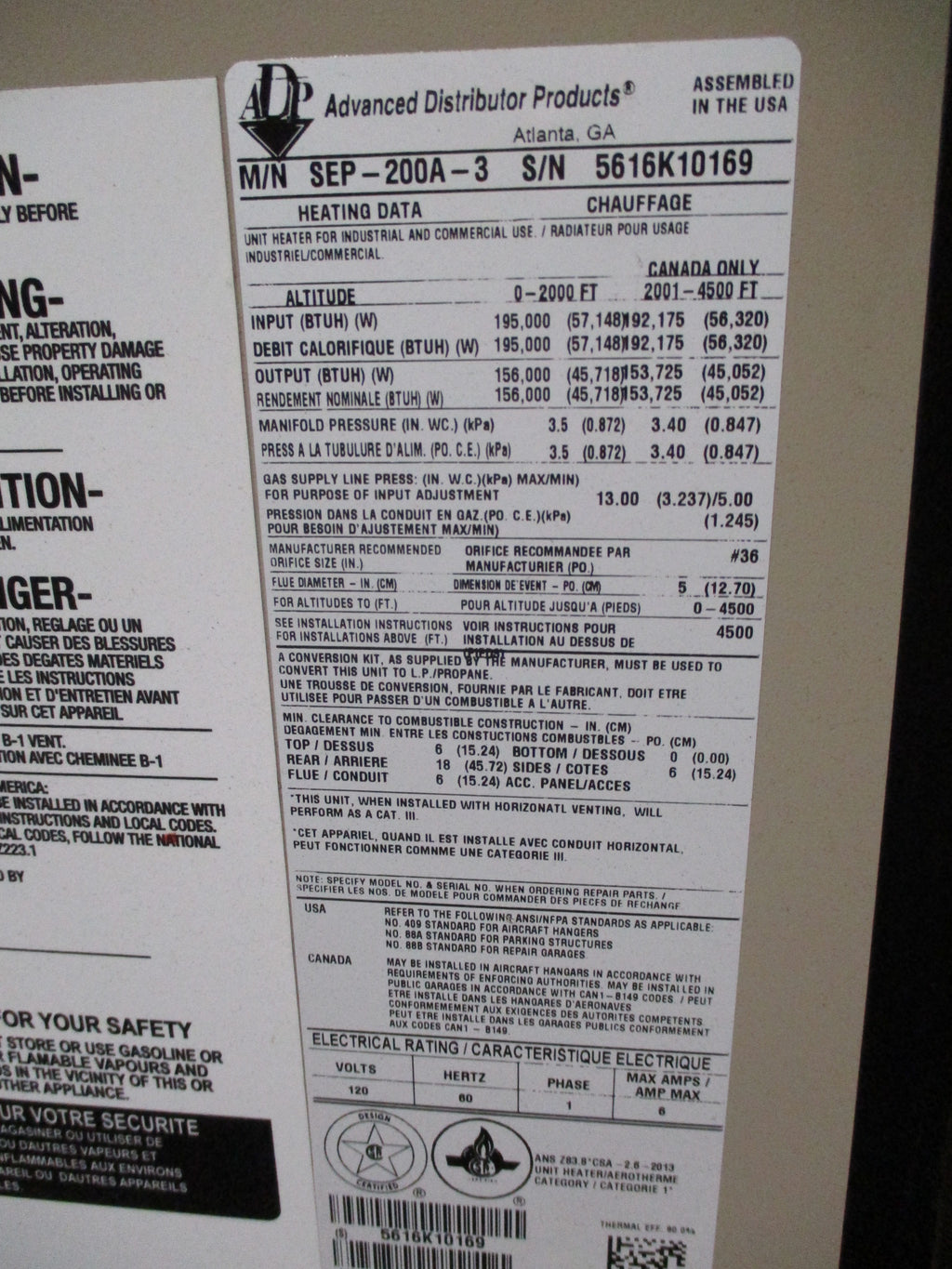 ADP Natural Gas Heater SEP-200A-3 195,000BTU Input Power Vented Used_x000D_ ADP Natural Gas Heater Part #: SEP-200A-3 195,000 BTU Input 156,000 BTU Output Power Vented Dims: 42" x 28" x 40" Weighs: 200 LBS Used Loc: AB11-7463 / AB40B4