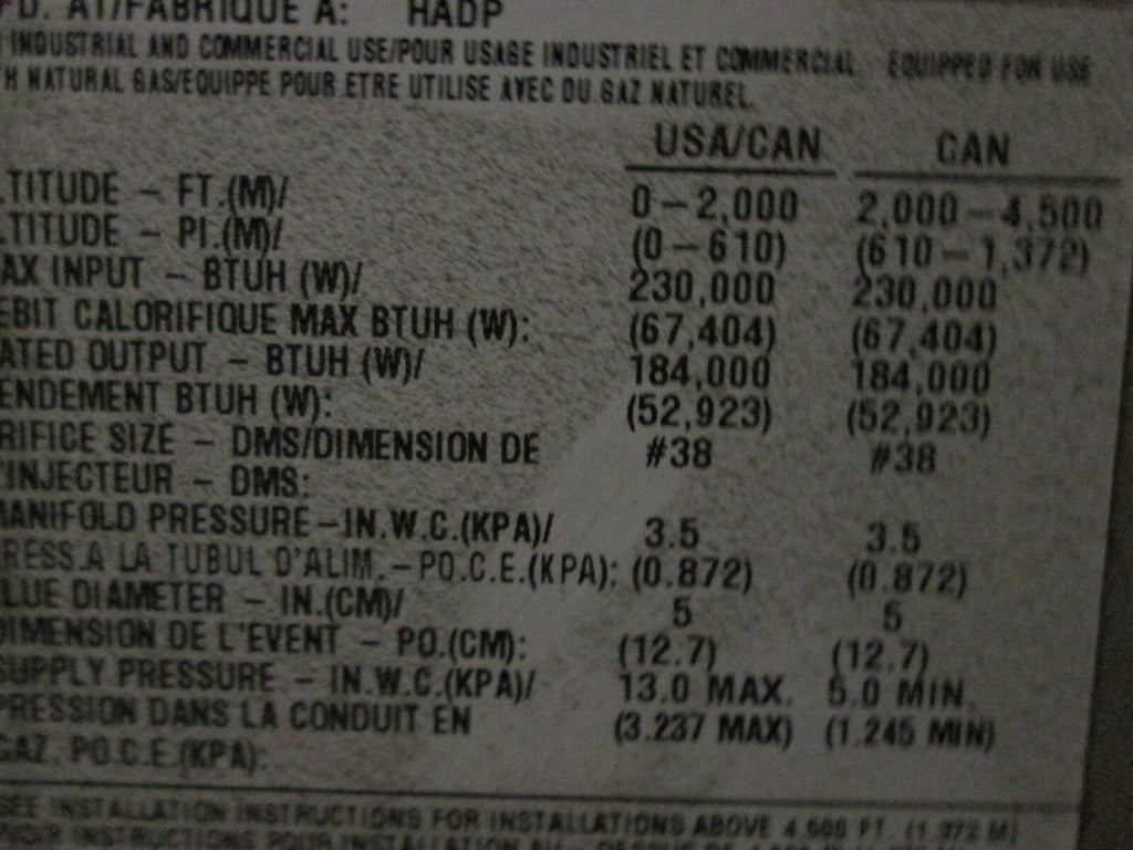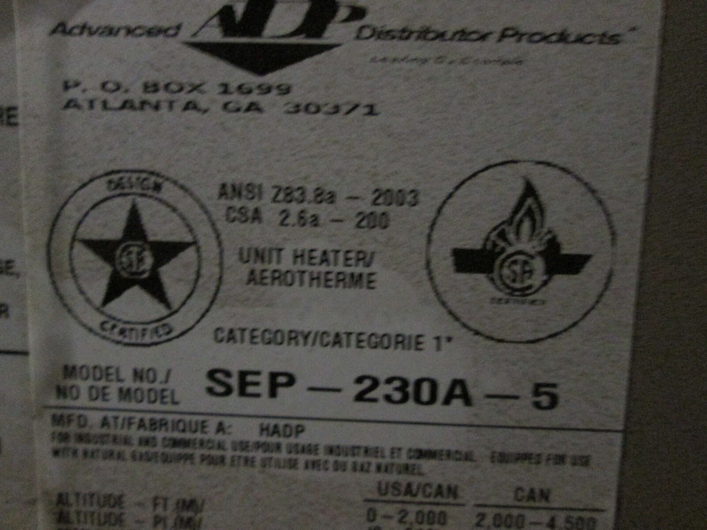 ADP Natural Gas Heater Part# SEP-230A-5 184,000 BTU Output 120v 60Hz 1ph 9A 5" Flute DiameterCondition: Used Loc:AB5D4-7 7E3-6- Part# SEP-230A-5
