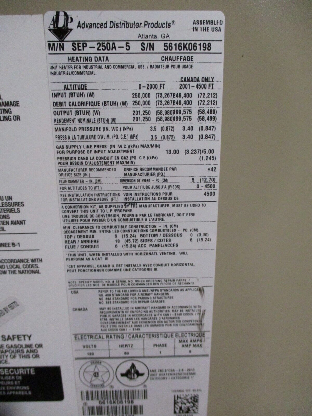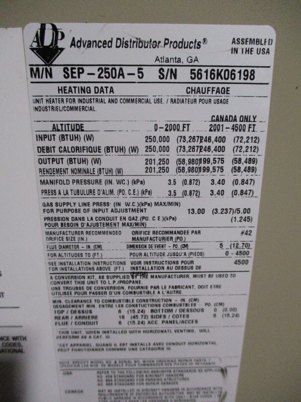 Advanced Distributor Products Natural Gas Heater SEP-250A-5 Power Vent Used