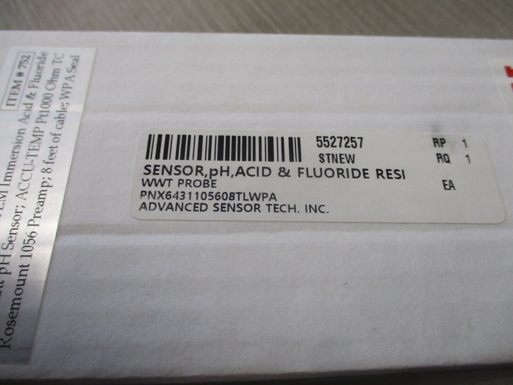 Advanced Sensor Tech Immersion Acid & Fluoride Resistant PH Sensor New Surplus Condition: New – Open boxBrand: Advanced Sensor TechMPN: PNX 6431-1056-08-TL-WPA Advanced Sensor Tech Immersion Acid & Fluoride Resistant PH Sensor New Surplus Advanced Sensor Tech Immersion Acid & Fluoride Resistant PH Sensor Part #: PNX 6431-1056-08-TL-WPA Rosemount 1056 Preamp 8ft Cable 3/4 "-1" MNPT New SurplusLOC: 27A4-4 Advanced Sensor Tech Immersion Acid & Fluoride Resistant PH Sensor Part #: PNX 6431-1056-08-TL-WPA Rosemount 1056 Preamp 8ft Cable 3/4 "-1" MNPT New Surplus LOC: 27A4-4