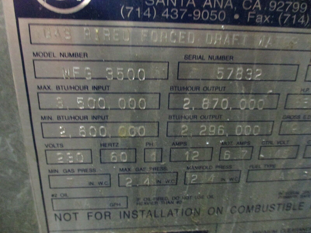 Ajax Natural Gas Boiler Part #: WFG 3500 3,500,000BTU Input 2,870,000BTU Output 230V 1Ph 60Hz 12A MFD: 2000 Used LOC AB11-4024