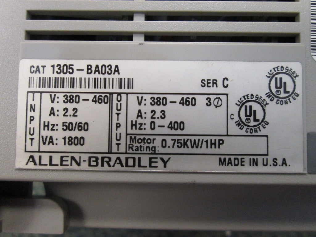 Allen-Bradley 1305 AC Drive 1305-BA03A 1HP *Missing Cover* Series May Vary Used Condition: UsedMaximum Load: 1 HPBrand: Allen-BradleyModel: 1305 AC DriveMPN: 1305-BA03A Allen-Bradley 1305 AC Drive 1305-BA03A 1HP *Missing Cover* Series May Vary Used Allen-Bradley 1305 AC Drive Part # 1305-BA03A 1HP Input: 380-460V 2.2A 50/60Hz 1800VA 3Ph Output: 380-460V 2.3A 0-400Hz 3Ph Used - Missing Cover *Series May Vary* LOC: 18B3-5 / 18D3-5 / AB41E4 Allen-Bradley 1305 AC Drive Part # 1305-BA03A 1HP Input: 380-460V 2.2A 50/60Hz 1800VA 3Ph Output: 380-460V 2.3A 0-400Hz 3Ph Uséd - Missing Cover *Series May Vary* LOC: 18B3-5 / 18D3-5 / AB41E4