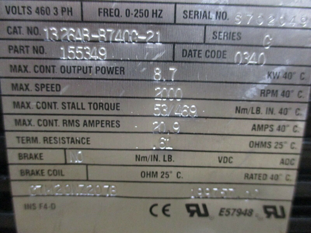 Allen-Bradley 1326 AC Servo Motor 1326AB-B740C-21 8.7KW 2000RPM 460V 20.9A Used_x000D_ Condition: UsedMPN: 1326AB-B740C-21Brand: Allen-Bradley Allen-Bradley 1326 AC Servo Motor 1326AB-B740C-21 8.7KW 2000RPM 460V 20.9A Used Allen-Bradley 1326 AC Servo Motor Part #: 1326AB-B740C-21 8.7KW 2000RPM 460V 20.9A 3Ph0 - 250HzUsedLOC AB11-33 / AB5K1 Allen-Bradley 1326 AC Servo Motor Part #: 1326AB-B740C-21 8.7KW 2000RPM 460V 20.9A 3Ph 0 - 250Hz Uséd LOC AB11-33 / AB5K1