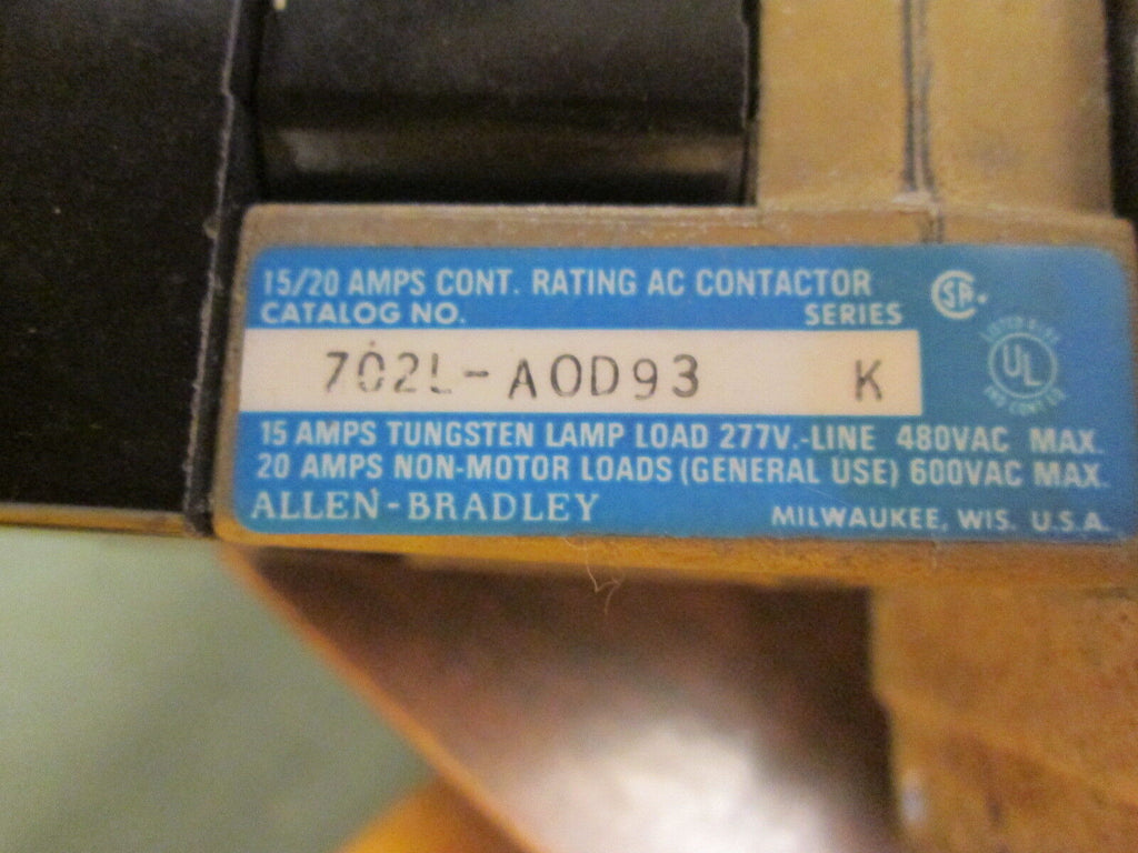 Allen-Bradley AC Contactor 702L-AOD93 15/20A 120V Coil 480/600V Used_x000D_ Condition: UsedBrand: Allen-BradleyMPN: 702L-AOD93 Allen-Bradley AC Contactor 702L-AOD93 15/20A 120V Coil 480/600V Used Allen-Bradley AC Contactor Part #: 702L-AOD93 15/20A 120V Coil480/600V UsedLOC 2I4-29 Allen-Bradley AC Contactor Part #: 702L-AOD93 15/20A 120V Coil 480/600V Uséd LOC 2I4-29