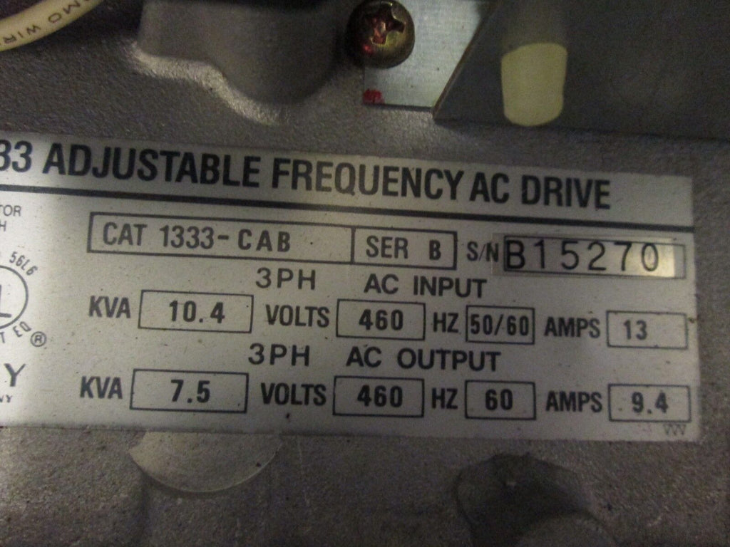 Allen-Bradley AC Drive 1333-CAB 5HP *Missing Cover Screw* Used Condition: UsedBrand: Allen-BradleyModel: AC DriveMPN: 1333-CAB Allen-Bradley AC Drive 1333-CAB 5HP *Missing Cover Screw* Used Allen-Bradley AC Drive 1333-CAB 5HP Input: 3Ph, 10.4KVA, 460V, 50/60Hz, 13AOutput: 3Ph, 7.5KVA, 460V, 60Hz, 9.4AMissing Cover ScrewLOC: 10E2-5 Allen-Bradley AC Drive 1333-CAB 5HP Input: 3Ph, 10.4KVA, 460V, 50/60Hz, 13A Output: 3Ph, 7.5KVA, 460V, 60Hz, 9.4A Missing Cover Screw LOC: 10E2-5