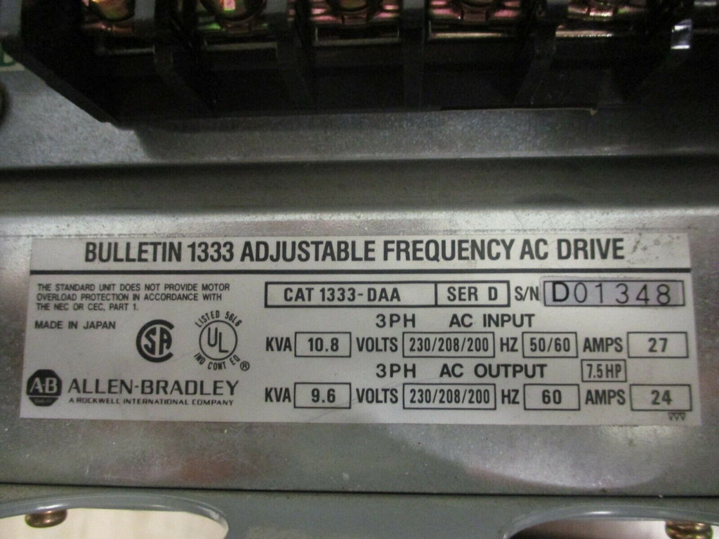 Allen-Bradley AC Drive 1333-DAA Ser. D 7.5HP 3Ph Used Condition: UsedMaximum Load: 7.5 HPMPN: 1333-DAABrand: Allen-Bradley Allen-Bradley AC Drive 1333-DAA Ser. D 7.5HP 3Ph Used Allen-Bradley AC Drive Part #: 1333-DAA Ser. D 7.5HP 3PhInput:230/208/200V50/60Hz27AOutput:230/208/200V60Hz24AUsedLOC AB13D2-4 Allen-Bradley AC Drive Part #: 1333-DAA Ser. D 7.5HP 3Ph Input: 230/208/200V 50/60Hz 27A Output: 230/208/200V 60Hz 24A Uséd LOC AB13D2-4