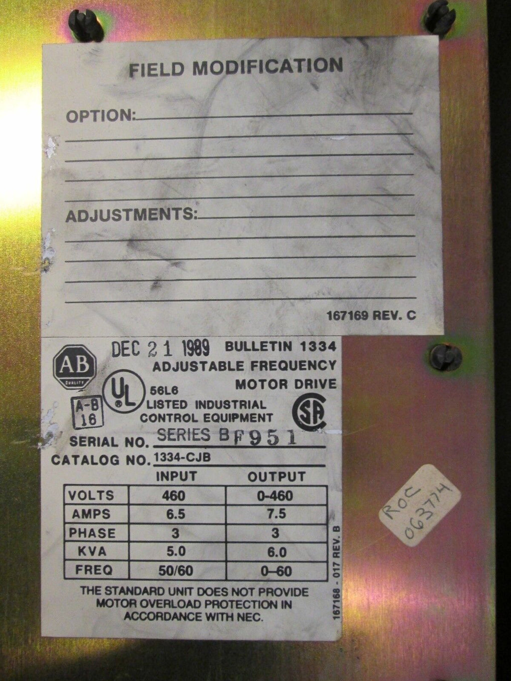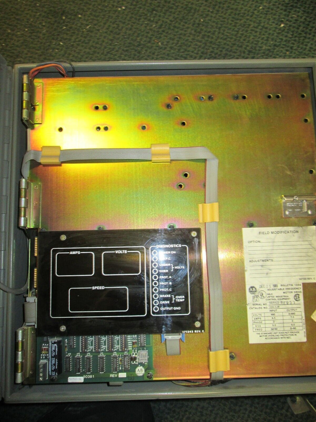 Allen-Bradley AC Drive 1334-CJB 3Ph IN: 6.5A 460V OUT: 7.5A 0-460V Used Condition: UsedBrand: Allen-BradleyMPN: 1334-CJBInput Voltage: 460 V Allen-Bradley AC Drive 1334-CJB 3Ph IN: 6.5A 460V OUT: 7.5A 0-460V Used Allen-Bradley AC Drive 1334-CJB Input: Amps: 6.5 Volts: 460Phase: 3KVA: 5.0Freq: 50/60 Output: Amps: 7.5 Volts: 0-460Phase: 3KVA: 6.0Freq: 0-60 Used LOC# AB5G3-6 Allen-Bradley AC Drive 1334-CJB Input: Amps: 6.5 Volts: 460 Phase: 3 KVA: 5.0 Freq: 50/60 Output: Amps: 7.5 Volts: 0-460 Phase: 3 KVA: 6.0 Freq: 0-60 Uséd LOC# AB5G3-6
