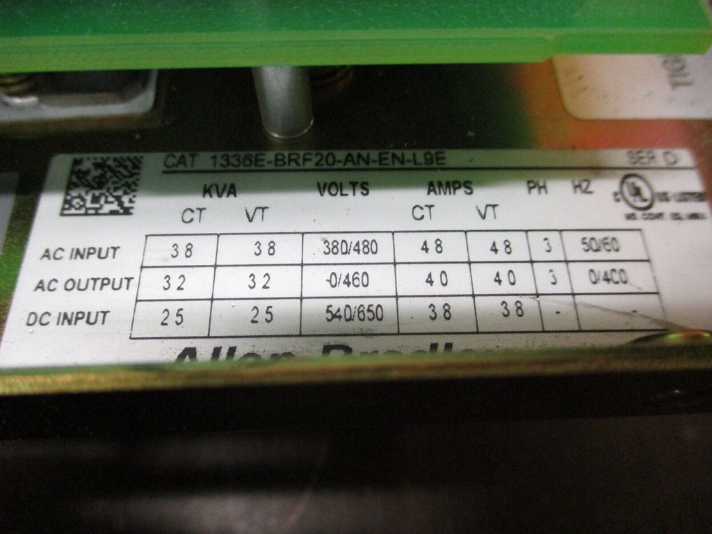 Allen-Bradley AC Drive Part #: 1336E-BRF20-AN-EN-L9E Ser. D 2 HP3Ph Input:380/480 V48 A50/60 HzOutput:0/460 V40 A0/400 Hzw/ Keypad *Open Chassis* Used Loc: 27F1-8- Part #: 1336E-BRF20-AN-EN-L9E