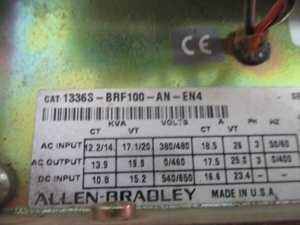 Allen-Bradley AC Drive 1336S-BRF100-AN-EN4-L6 10HP 3Ph *Broken L6 Terminal* Used Condition: UsedBrand: Allen-BradleyMaximum Load: 10 HPMPN: 1336S-BRF100-AN-EN4-L6 Allen-Bradley AC Drive 1336S-BRF100-AN-EN4-L6 10HP 3Ph *Broken L6 Terminal* Used Allen-Bradley AC Drive Part #: 1336S-BRF100-AN-EN4-L6 10 HP 3Ph Input: 12.2/14KVA380/480V18.5A50/60HzOutput: 13.9KVA0/460V17.5A0/400Hz*Broken L6 Terminal*UsedLoc: AB4I2-8 Allen-Bradley AC Drive Part #: 1336S-BRF100-AN-EN4-L6 10 HP 3Ph Input: 12.2/14KVA 380/480V 18.5A 50/60Hz Output: 13.9KVA 0/460V 17.5A 0/400Hz *Broken L6 Terminal* Uséd Loc: AB4I2-8