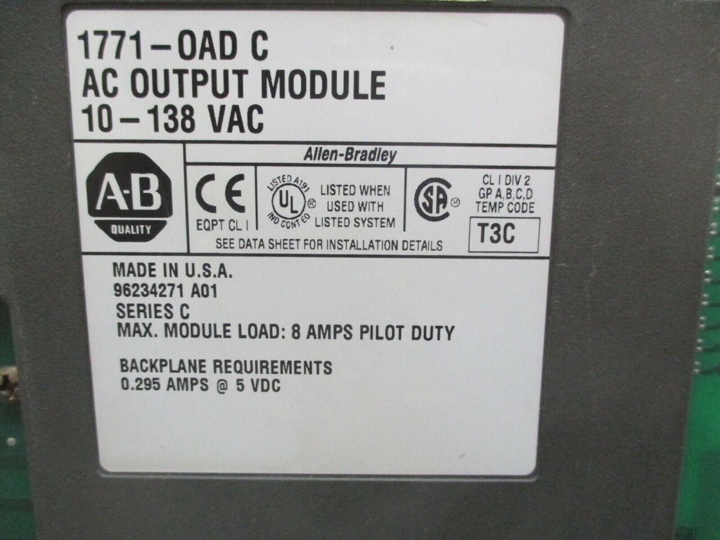 Allen-Bradley AC Output Module 1771-OAD C Ser. C 10-138VAC Used Condition: UsedMPN: 1771-OAD CBrand: Allen-Bradley Allen-Bradley AC Output Module 1771-OAD C Ser. C 10-138VAC Used Allen-Bradley AC Output Module Part #: 1771-OAD C Ser. C 10-138VAC UsedLOC 20C4-35 Allen-Bradley AC Output Module Part #: 1771-OAD C Ser. C 10-138VAC Uséd LOC 20C4-35