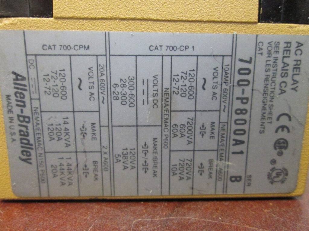 Allen-Bradley AC Relay 700-P800A1 120V Coil Used Condition: UsedModel: AC RelayMPN: 700-P800A1Brand: Allen-Bradley Allen-Bradley AC Relay 700-P800A1 120V Coil Used Allen-Bradley AC Relay Part #: 700-P800A1 120V CoilUsedLOC# 17E2-29 / 12G4-7 Allen-Bradley AC Relay Part #: 700-P800A1 120V Coil Uséd LOC# 17E2-29 / 12G4-7