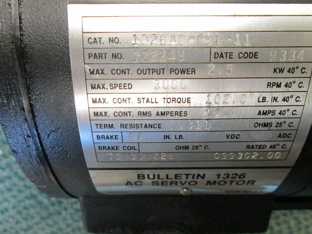 Allen-Bradley AC Servo Motor 1326AB-B2E-11 2.5 KW 3000 RPMs Condition: UsedBrand: Allen-BradleyMPN: 1326AB-B2EPower Rating: 2.5 kW Allen-Bradley AC Servo Motor 1326AB-B2E-11 2.5 KW 3000 RPMs Allen-Bradley AC Servo Motor 1326AB-B2E-11 2.5 KW 3000 RPMsLOC: 2I1-3 Allen-Bradley AC Servo Motor 1326AB-B2E-11 2.5 KW 3000 RPMs LOC: 2I1-3