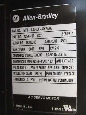 Allen-Bradley AC Servo Motor w/ Gear MPL-A4540F-SK22AA 2.6kW 3000RPM 230V 3Ph Condition: UsedActual Rated Input Voltage: 230 VBrand: Allen-BradleyMPN: MPL-A4540F-SK22AANominal Rated Input Voltage: 230 VPower (kw): 2.6 kw Allen-Bradley AC Servo Motor w/ Gear MPL-A4540F-SK22AA 2.6kW 3000RPM 230V 3Ph Allen-Bradley AC Servo Motor w/ Gear Part #: MPL-A4540F-SK22AA 2.6 kW 3000 RPM 230 V 3PhBayside Gear: Part #: RS142-050Ratio 50:1 UsedLoc: AB11-7176 / AB41A2 Allen-Bradley AC Servo Motor w/ Gear Part #: MPL-A4540F-SK22AA 2.6 kW 3000 RPM 230 V 3Ph Bayside Gear: Part #: RS142-050 Ratio 50:1 Uséd Loc: AB11-7176 / AB41A2