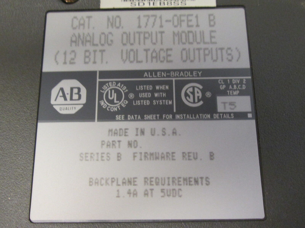 Allen-Bradley Analog Output Module Part #: 1771-OFE1 12-Bit Voltage Outputs Ser B F/W Rev B 1.4A @ 5VDCUsedLOC 14E5-32- Part #: 1771-OFE1